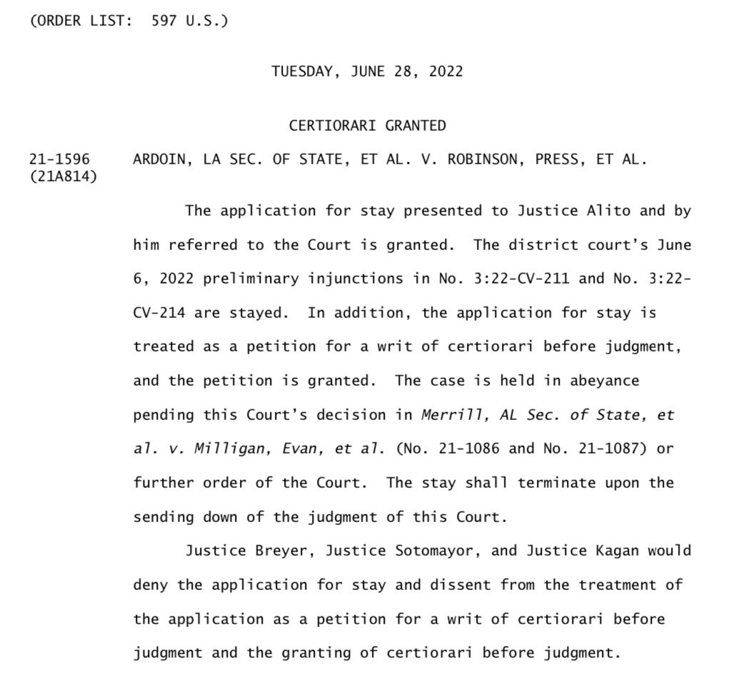 In unsigned, unexplained orders, #SCOTUS *blocked* those rulings — resulting in three R seats that would likely have been D seats.